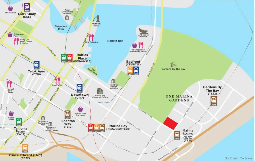 One Marina Gardens 滨海花园一号, located in the heart of the 45-hectare Marina South precinct envisioned under the URA Masterplan. Designed as a self-sustaining mixed-use development, it provides unparalleled convenience, with essential amenities within a 10-minute walk. Residents have access to shopping malls, diverse dining options, food courts, offices, medical clinics, hotels, and seamless access to public transportation—all within easy reach for a connected and vibrant lifestyle.